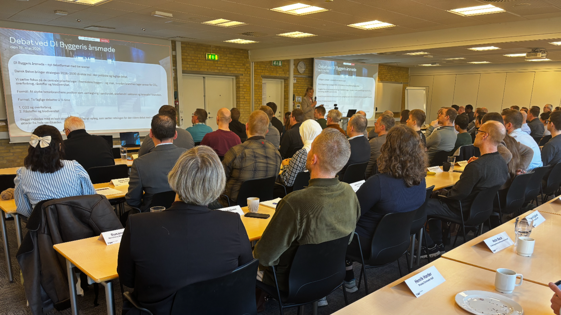 Deltagere på medlemsmødet i Betonelement-Foreningen præsenteres for forskellige faglige og tekniske oplæg. Mange oplæg tager udgangspunkt i hverdagens udfordringer.