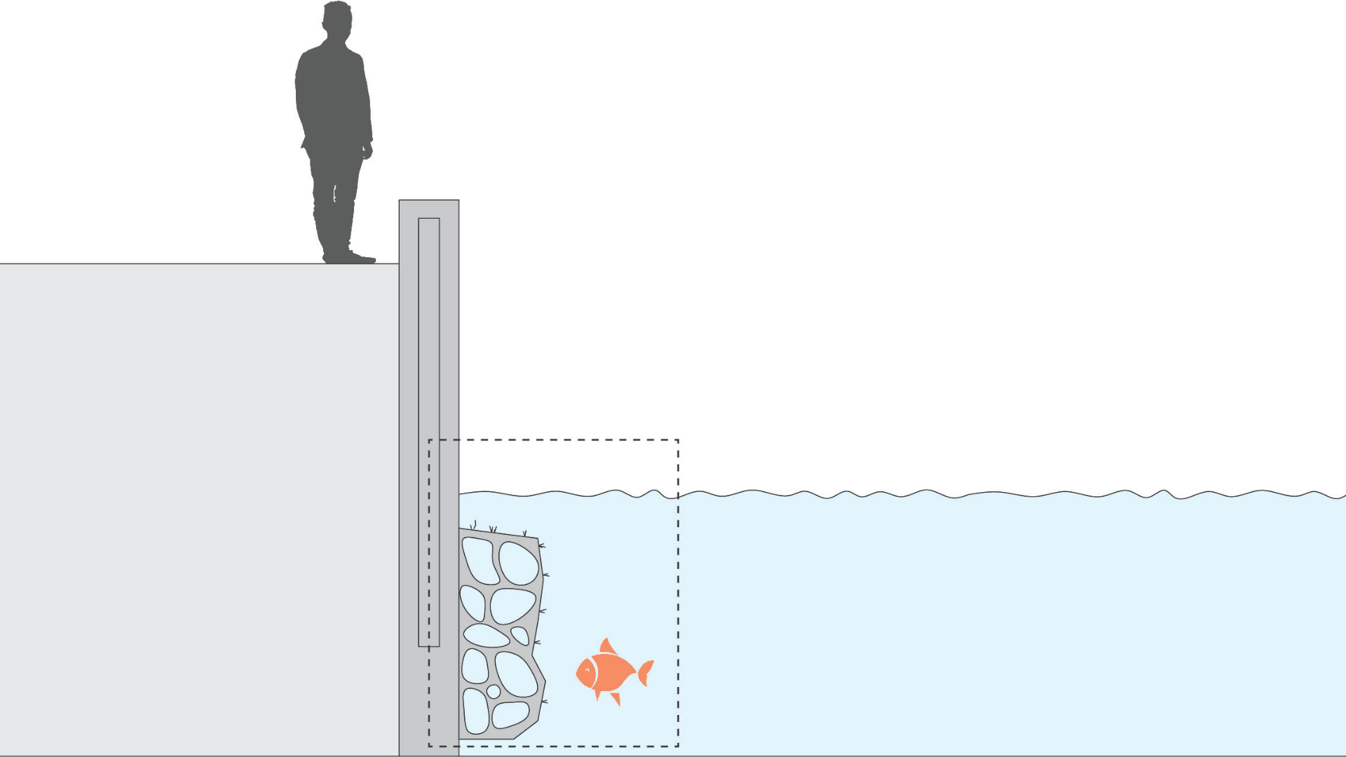 Typiske konstruktioner med glatte spuns- og betonvægge giver minimal overflade for marine organismer at fæste sig på og etablere levesteder. Helt modsat naturen som skaber komplekse overflader med revner, huller og ujævnheder, der huser mangfoldige arter.