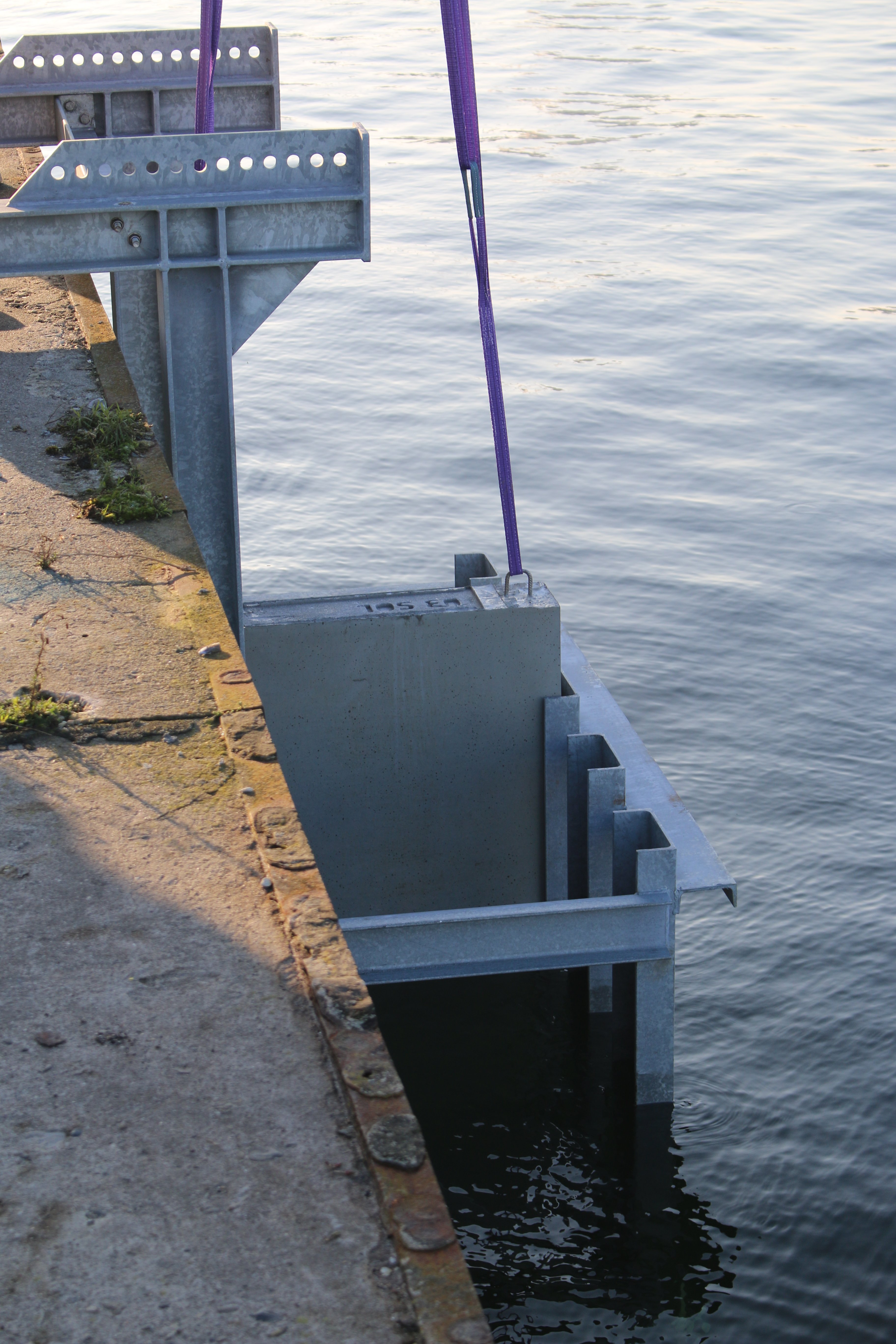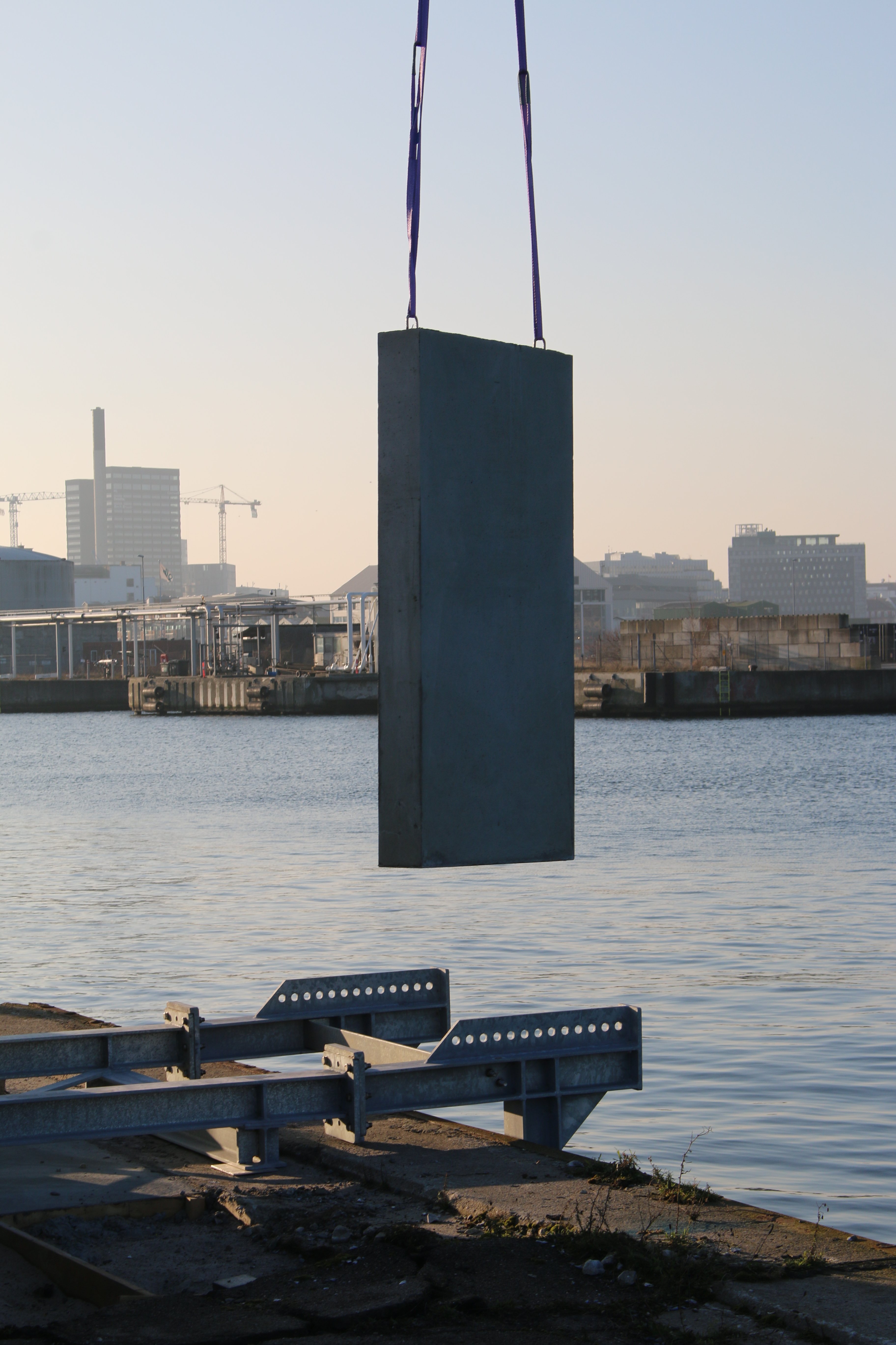 Nedsænkning af de første betonelementer i havvandet ved eksponeringspladsen i Aarhus Havn.