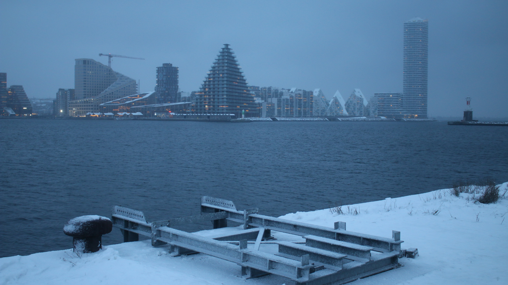 Eksponeringsriggene blev monteret på en snedækket kajkant i Aarhus Havn en kold januardag.