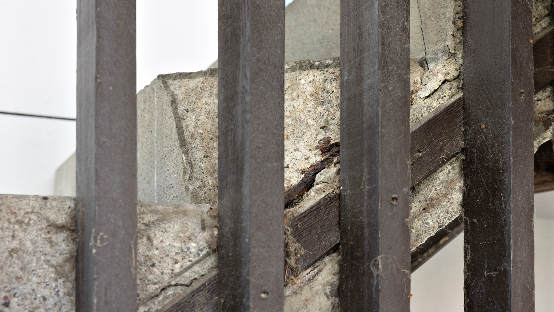 Her ses tydeligt, hvad der er galt med den udvendige gavltrappe på bygningen Hammershøj i Helsingør. Mange modernistiske bygninger er kendetegnet ved konstruktioner i jernbeton med armering tæt på overfladen, hvilket gør dem sårbare over for korrosion og skader. Reparationer er ofte vanskelige, da nutidige bygningsnormer gør det svært at bevare den oprindelige, lette geometri, hvilket kan forringe såvel arkitektur som bæreevne. Formålet at sikre den statiske funktion samt de æstetiske kvaliteter uden at tilføre unødig klimabelastning.