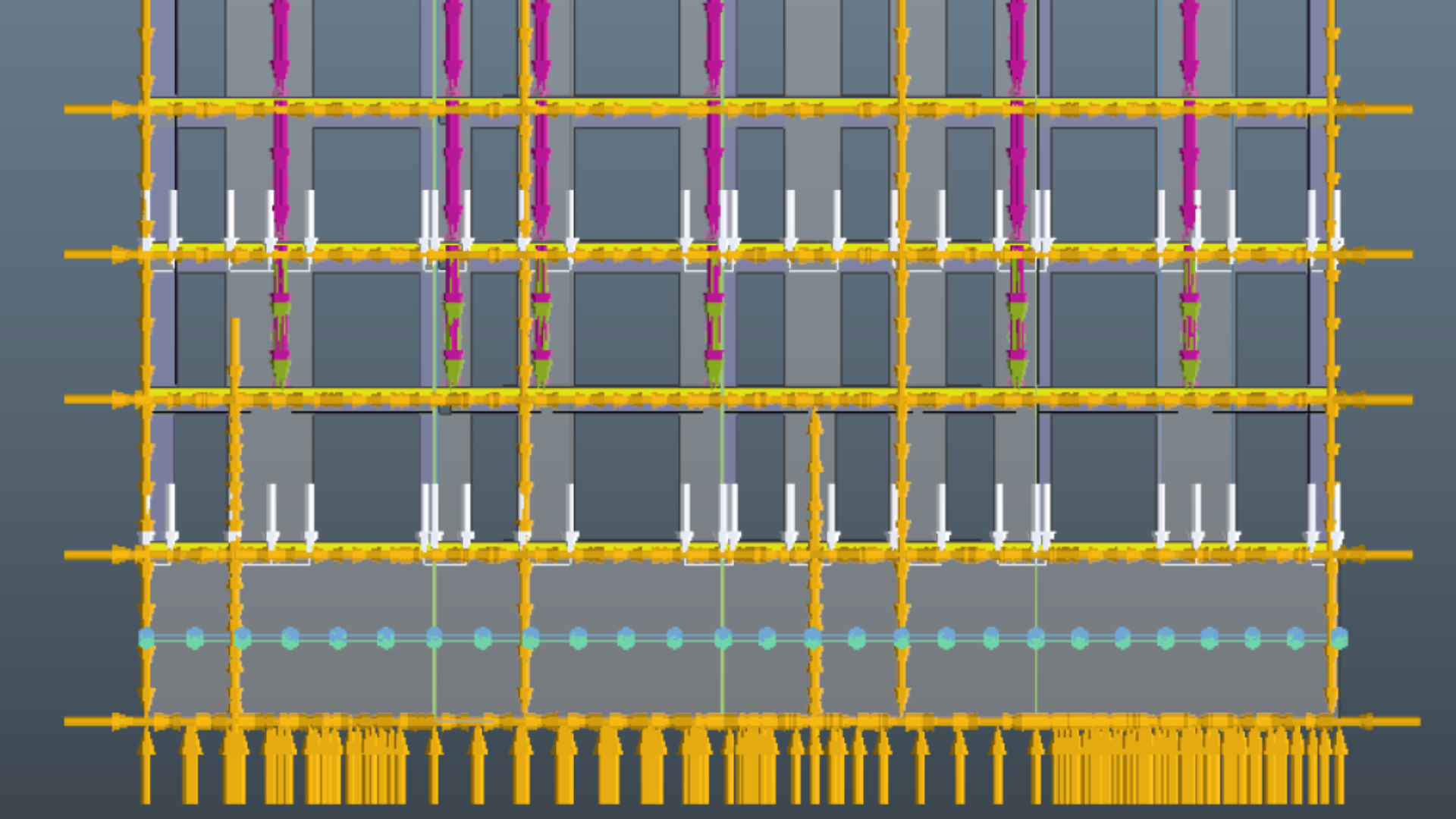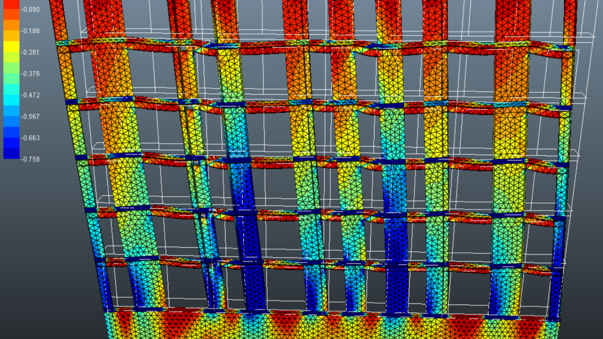 Her ses en model, der viser spændinger i betonen. Beregning af geometrien er klart det, der tager længst tid. Typisk bruges 50 procent af projekteringstiden på manuelt at opbygge modellen. Med scriptet kan den statiske analyse gennemføres på den halve tid.