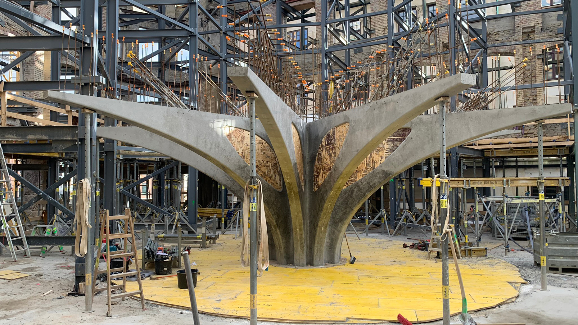 Dette billede er taget efter, at den centrale megasøjle er færdigstøbt. Under den gule afdækning kommer senere trappen til første sal til at sno sig op, og søjlens forgreninger kommer som grenene på et træ til at række ud mod hovedribberne på ribbedækket.