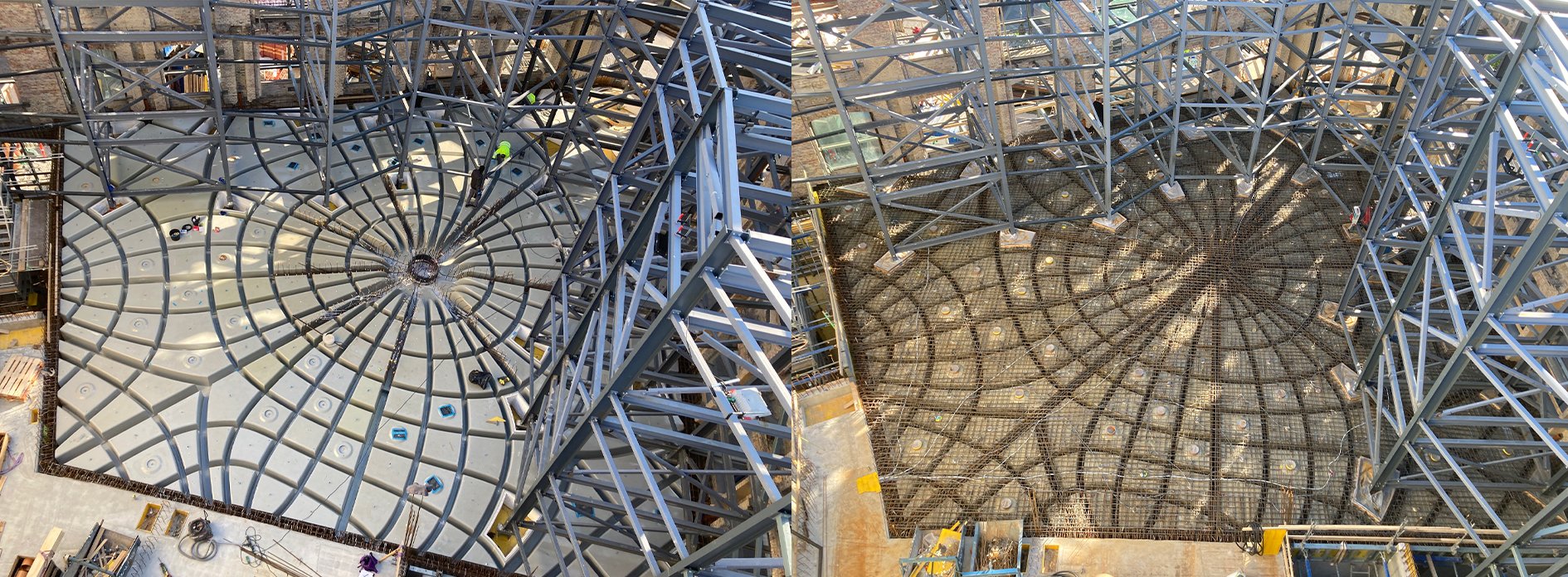 Foto: DesignGroup ArchitectsStøbningen blev foretaget i løbet af en enkelt arbejdsdag, og selv om det var en meget varm sommerdag, skete det uden problemer, blandt andet fordi sætmålet blev overvåget nøje. Det var dog heller ikke forventet, da man forinden havde støbt flere mockup-modeller af en del af ribbedækket for at teste processen af. Dog blev afforskallingen en smule kompleks, da polystyrenformene havde lidt sværere ved at slippe betonen end forudset.