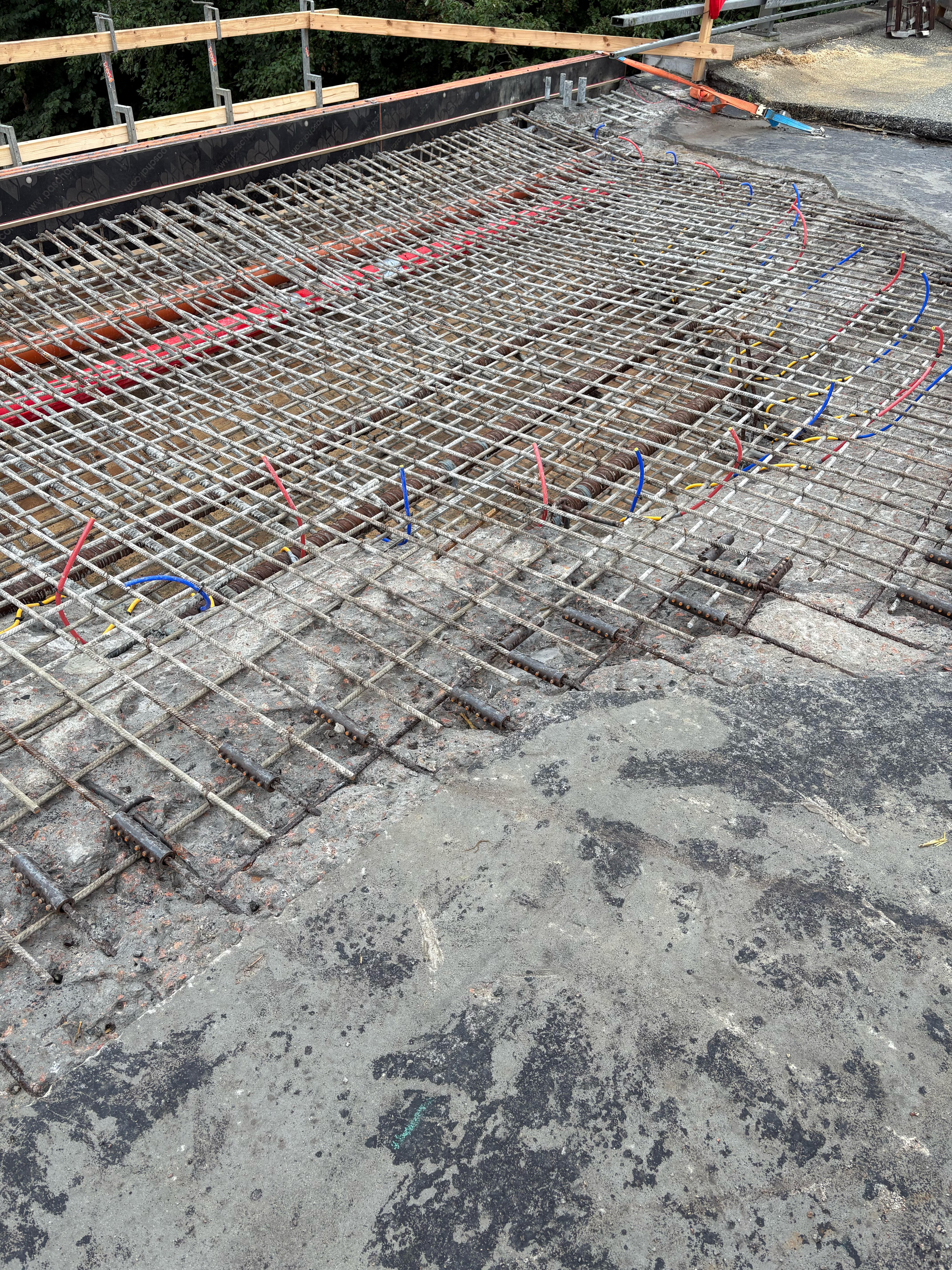 Her er man i fuld gang med udstøbningen. Grundet den valgte metode er armeringsgraden i den nye beton højere end i den omkringliggende, eksisterende beton.
